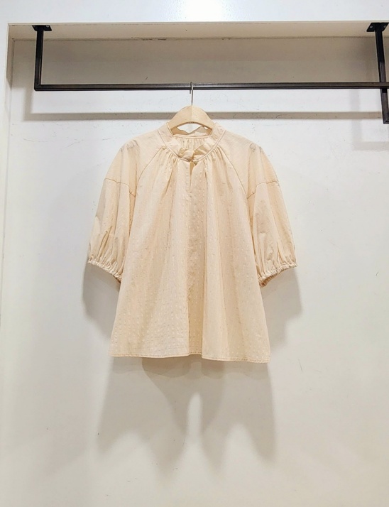 소매에 적당한 퍼프처리와 앞 뒤의 셔링이 있는 A라인이며